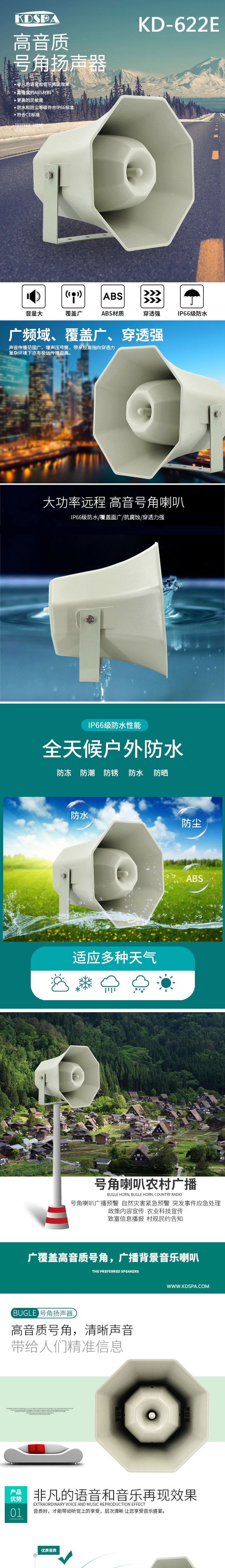 1)根據水電站的主體構造,在大壩外圍選用KD-622E号角式揚聲器。提供平時(shí)上下班打鈴、播放音樂以及消防緊急廣播使用。